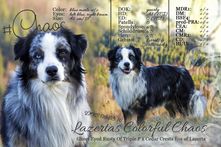 Cedar Crests Eos of Lazerta DOB: 14.09.13 Breed: Miniature Australian Shepherd Reg-Nr.: M-5877 Colour: dark red tri