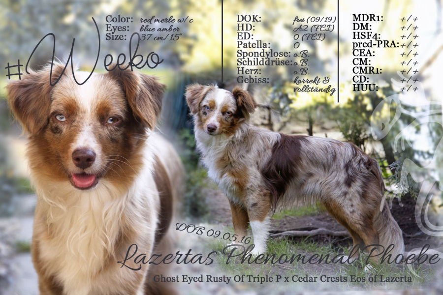 | Cedar Crests Eos of Lazerta DOB: 14.09.13 Breed: Miniature Australian Shepherd Reg-Nr.: M-5877 Colour: dark red tri
