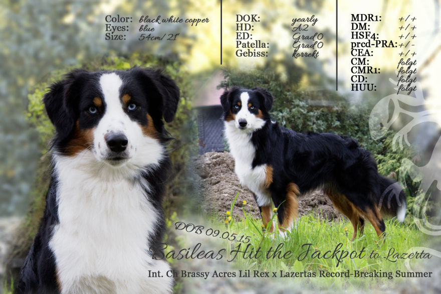 Int CH Brassy Acres Lil Rex DOB: 09.12.11 Breed: Miniature Australian Shepherd Reg-Nr.: M-4531-02 Colour: black tri