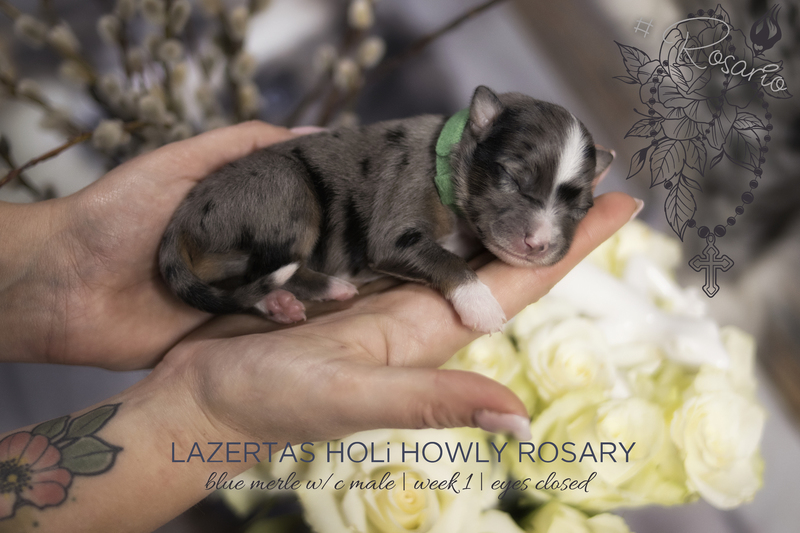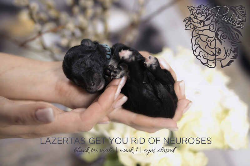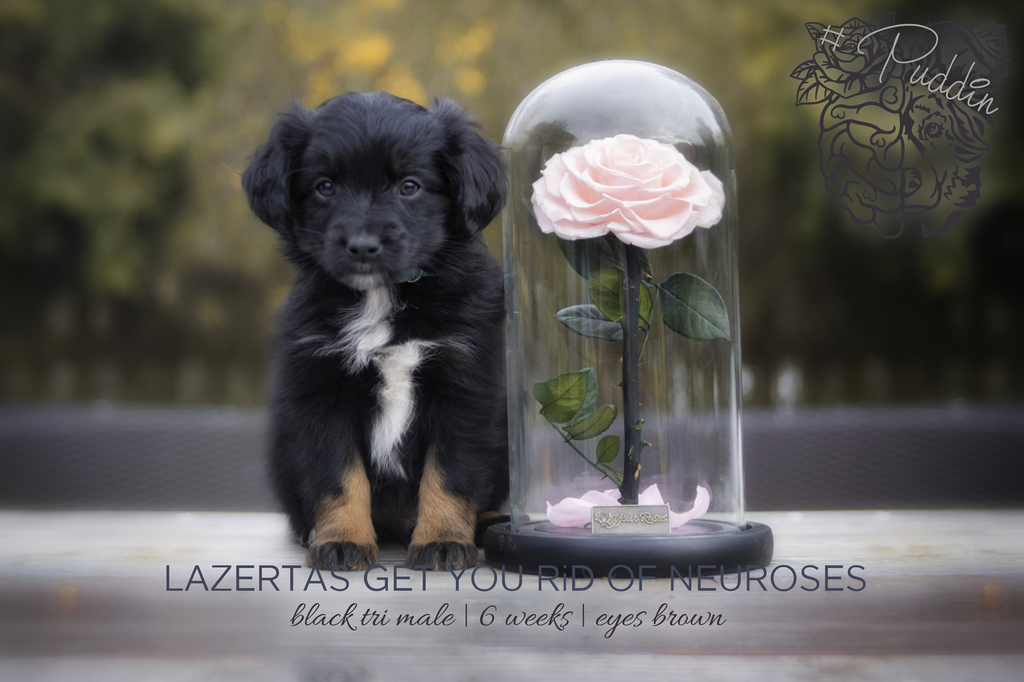 Puddin ist ein kleiner Quirl. Man erlebt ihn selten ruhig. Ein süßer lieber und eher kleiner Welpe. Er und sein Bruder Sprout stehen zur Wahl für einen jungen Mann, der mich das erste Mal anrief als die Rhapzody ganz klein war. Damals war auch er noch ein Junge, der so gerne unbedingt einen Aussie haben wollte, aber er müsse seine Eltern mit ins Boot nehmen. Der Kontakt ist nie abgebrochen und heute ist er erwachsen, super sportlich und erfüllt sich endlich seinen Traum. Ich wünsche es ihm und die Rhapzody hat uns sogar 2 Babies in seiner Lieblingsfarbe (black tri) geschenkt. Daumen sind gedrückt.