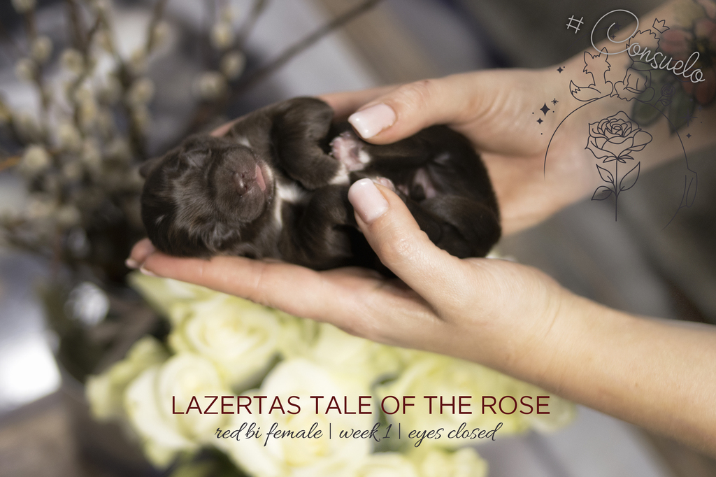 Dieser letzte Wurf musste ein ganz besonderes Wurfmotto bekommen. Die Wurfnamen von Lazertas Rhapzody und ihren Geschwistern enden alle auf „Kudoz 2 Roze“ -> „Großer Dank gebührt Rose“ - ihrer Mama. Ein letztes Mal teilen wir Rosies direkte Enkel mit der Welt. Der Papa ist der Ausnahmerüde Cross L’s Trafalger Law @ Mathola „Sanji“.
