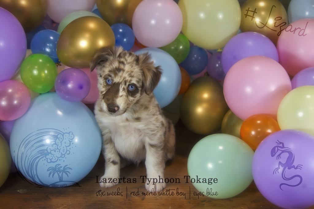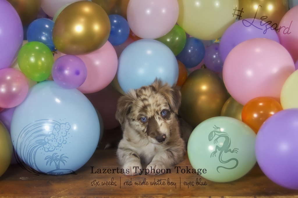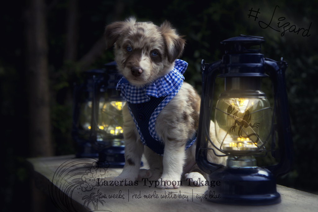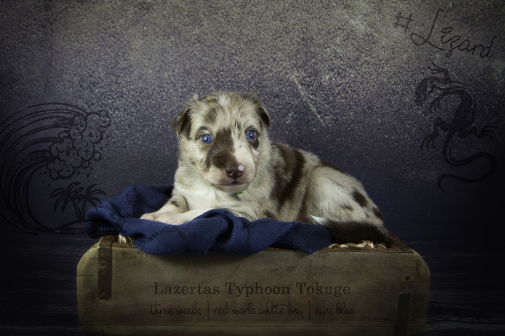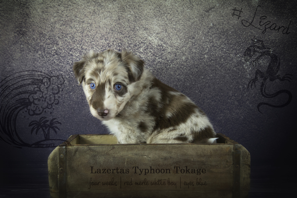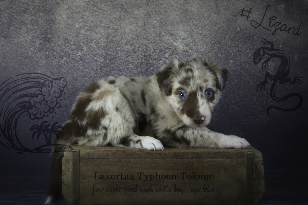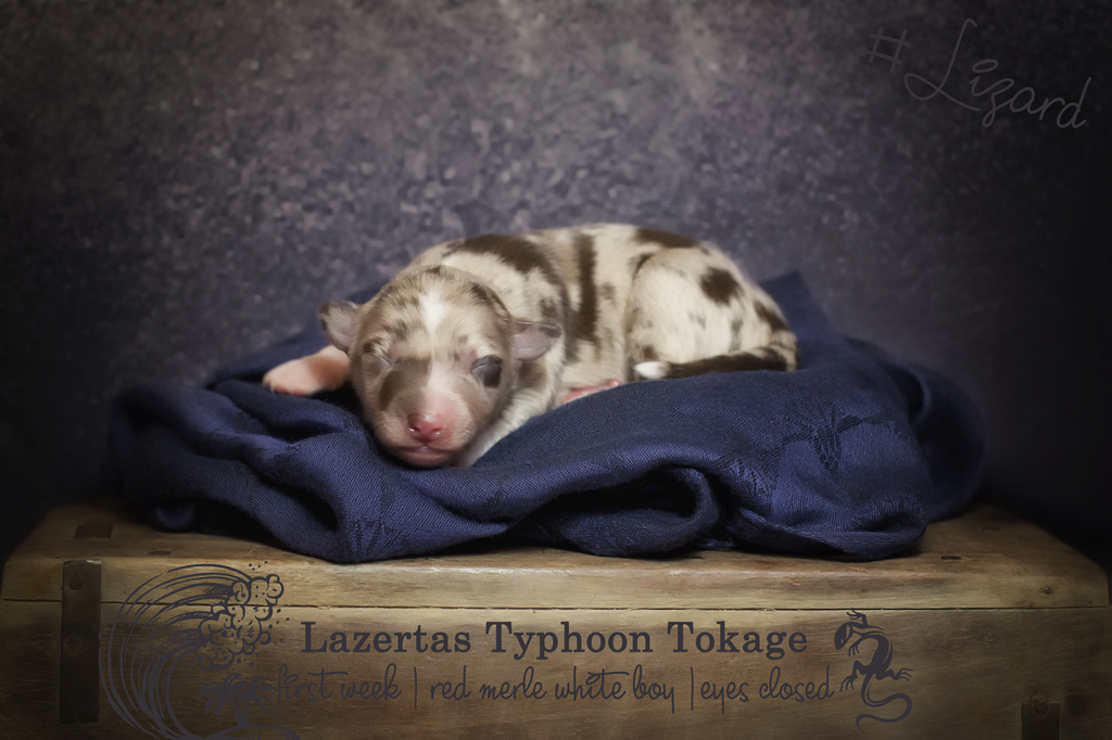 Okay, dann überflutete uns Lizard III mit seiner außergewöhnlichen Merlung. Noema hat sich bei ihm besonders viel Mühe gegeben und ihn mit den schönsten Schokotupfern verziert. Wie das aber so ist mit den Schönlingen, war er noch nicht besonders kooperativ - eben zappelig wie sein Namenstier. Eigentlich ist damit klar, dass ich ihn behalte...*lach* Tokage ist japanisch für die Eidechse. Mr. Oberschnuckel macht in der 2. Woche genauso fröhlich weiter. Mit 3 Wochen ist Lizard wesentlich weniger stürmisch als anfangs. Neue Situationen schafft er ohne "Tränen", ist offen und interagiert liebevoll mit uns. Auch dieses Temprament ist viel versprechend für eine soziale Aufgabe. Er schlingt nicht und ist auch sonst eher gemäßigt. Bei Lizard gab es einen deutlischen Entwicklungsschub in der 5. Lebenswoche. Sein Temperament und der Hunger haben bemerkenswert zugenommen. Er zeigt schon Anpirschen und spielt sich durch die Gegend. Er ist ein Denker, kein extremer Wedler. Für ihn wünsche ich mir vor allem eine sportliche Familie und das Hüten würde ihm sicher gefallen. Er hat den Körperbau für eine hohe Agilität. Eigentlich kehren wir zum ersten Eindruck zurück - für mich macht es das nicht leichter... Die Jungs sind diesmal eine Wucht <3 Eine ganz schwere Sache für mich. Es wird nicht leichter mit jedem Wurf, man gewöhnt sich nicht ans Abgeben. Er entwickelt sich weiterhin zu dem Traumhund, den ich seit der 4. Woche in ihm sehe und ich bin froh, dass er in unserer Nähe in Thüringen bleibt. Wir dürfen ihn auch weiter beobachten und seine Zuchteignung evaluieren. Ich kann nur hoffen, dass Nomi ... in 2 Jahren. Lizard darf seinen Namen behalten.