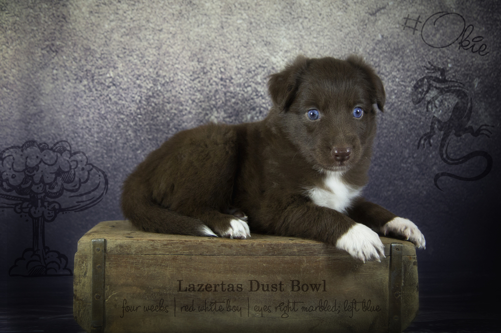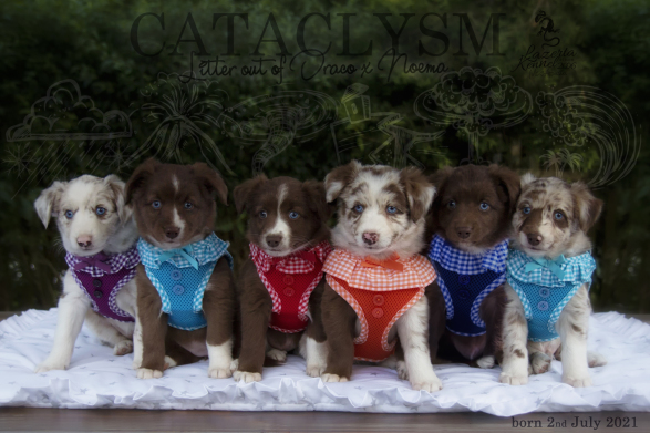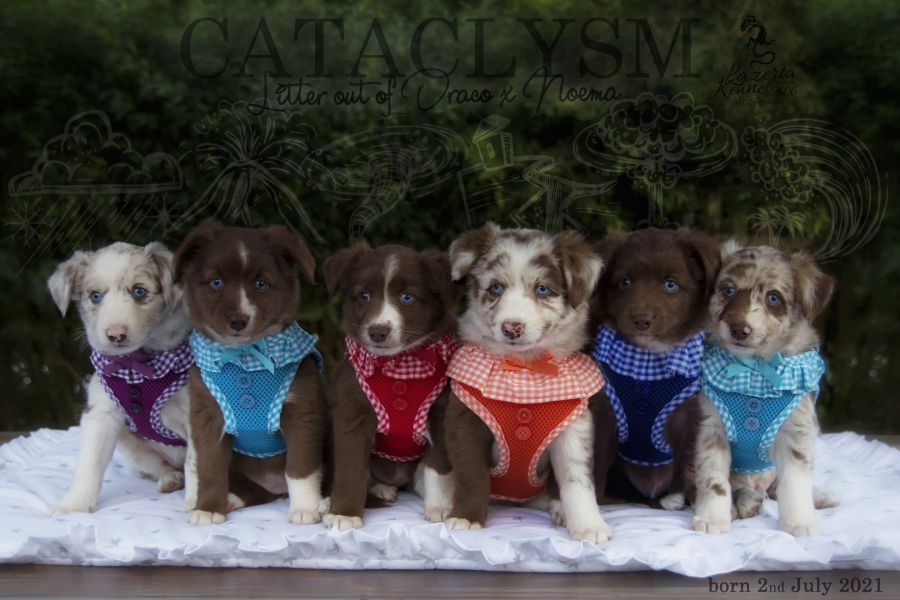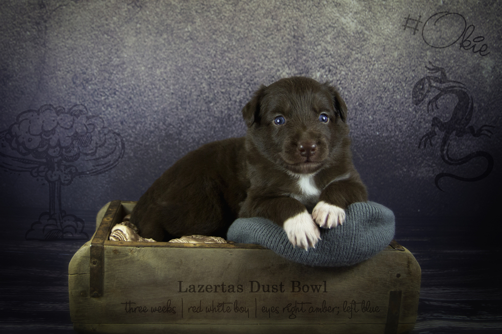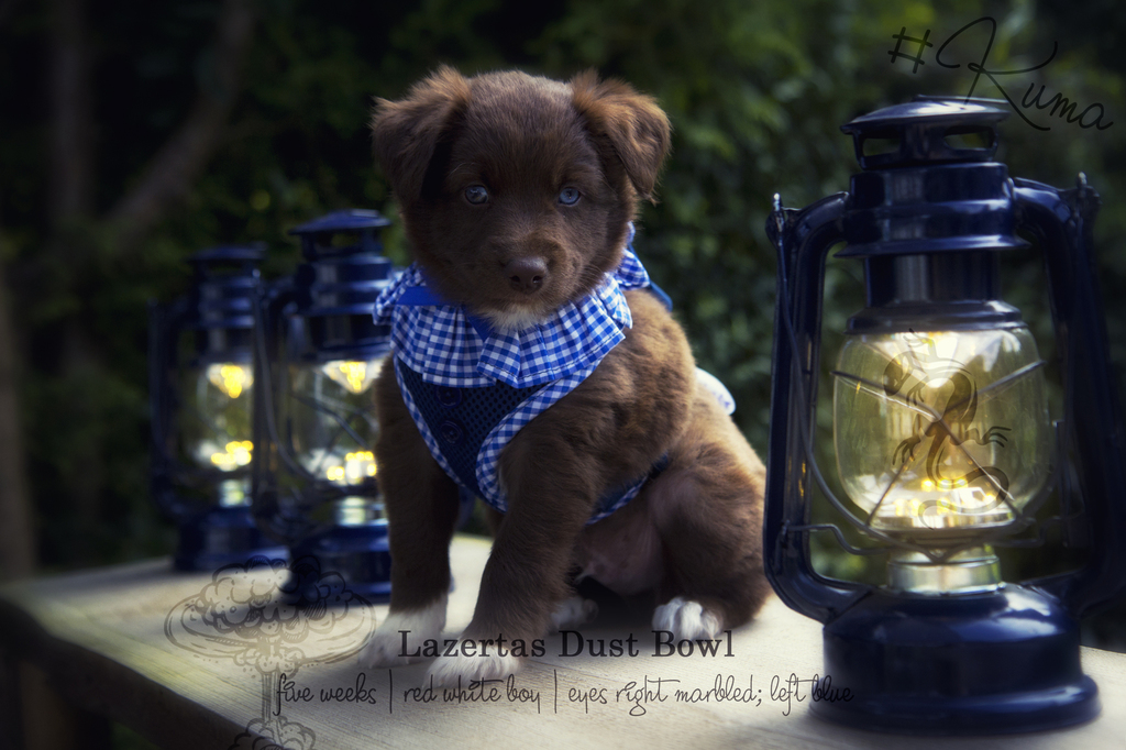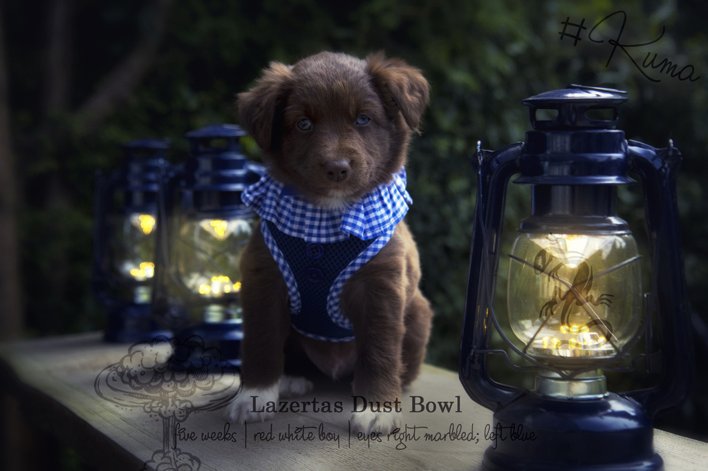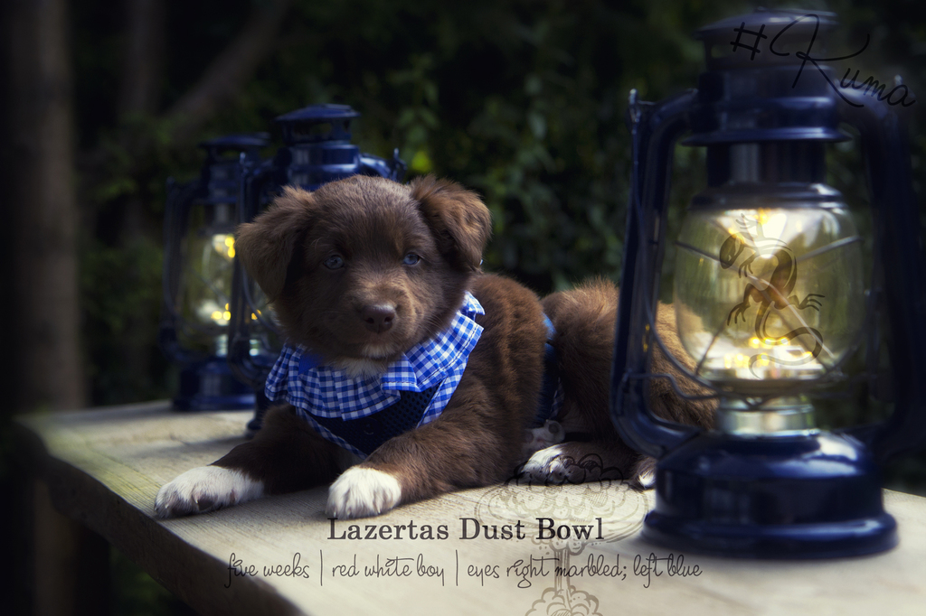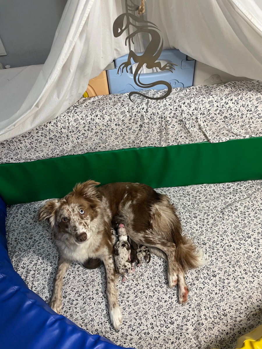 Okay, dann überflutete uns Lizard III mit seiner außergewöhnlichen Merlung. Noema hat sich bei ihm besonders viel Mühe gegeben und ihn mit den schönsten Schokotupfern verziert. Wie das aber so ist mit den Schönlingen, war er noch nicht besonders kooperativ - eben zappelig wie sein Namenstier. Eigentlich ist damit klar, dass ich ihn behalte...*lach* Tokage ist japanisch für die Eidechse. Mr. Oberschnuckel macht in der 2. Woche genauso fröhlich weiter. Mit 3 Wochen ist Lizard wesentlich weniger stürmisch als anfangs. Neue Situationen schafft er ohne "Tränen", ist offen und interagiert liebevoll mit uns. Auch dieses Temprament ist viel versprechend für eine soziale Aufgabe. Er schlingt nicht und ist auch sonst eher gemäßigt. Bei Lizard gab es einen deutlischen Entwicklungsschub in der 5. Lebenswoche. Sein Temperament und der Hunger haben bemerkenswert zugenommen. Er zeigt schon Anpirschen und spielt sich durch die Gegend. Er ist ein Denker, kein extremer Wedler. Für ihn wünsche ich mir vor allem eine sportliche Familie und das Hüten würde ihm sicher gefallen. Er hat den Körperbau für eine hohe Agilität. Eigentlich kehren wir zum ersten Eindruck zurück - für mich macht es das nicht leichter... Die Jungs sind diesmal eine Wucht <3 Eine ganz schwere Sache für mich. Es wird nicht leichter mit jedem Wurf, man gewöhnt sich nicht ans Abgeben. Er entwickelt sich weiterhin zu dem Traumhund, den ich seit der 4. Woche in ihm sehe und ich bin froh, dass er in unserer Nähe in Thüringen bleibt. Wir dürfen ihn auch weiter beobachten und seine Zuchteignung evaluieren. Ich kann nur hoffen, dass Nomi ... in 2 Jahren. Lizard darf seinen Namen behalten.