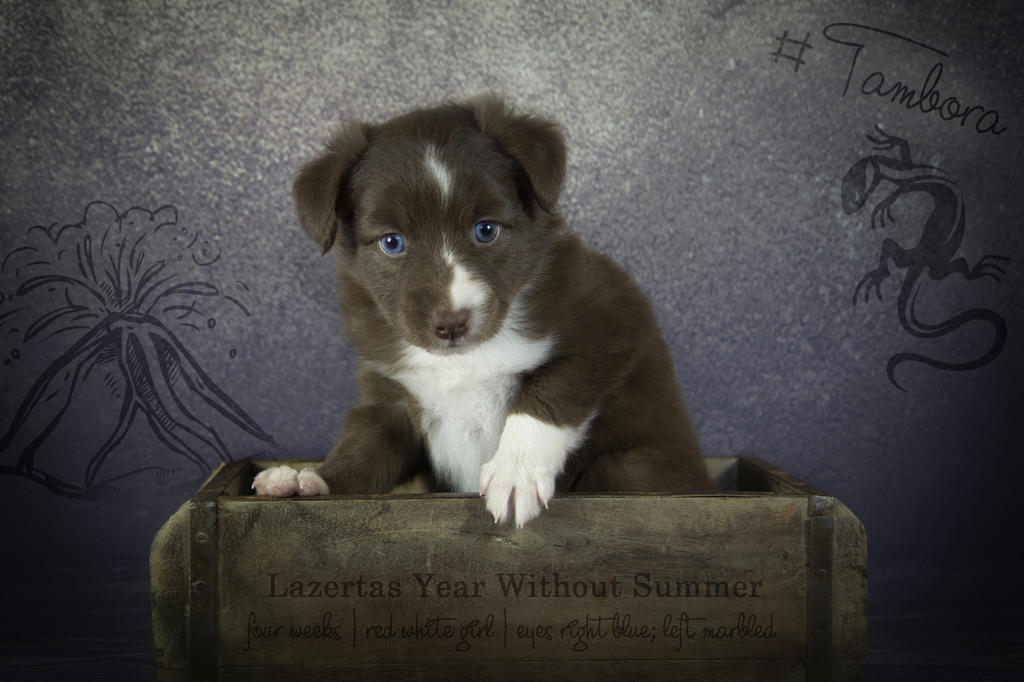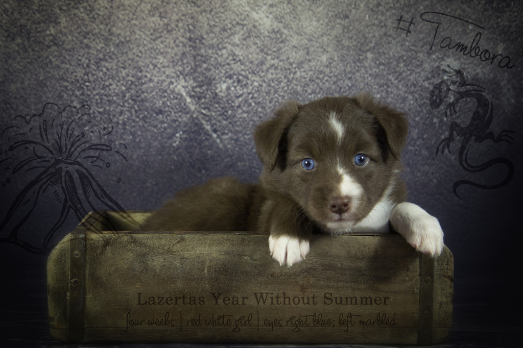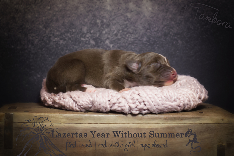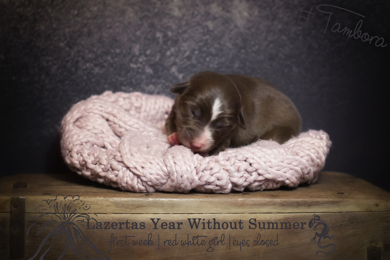 Tambora eruptierte in diese Welt und machte den Weg frei für sich und ihre gewaltigen Geschwister. Ach joi gleich als Erste so ein schönes Apfelköpfchen mit einer zarten Blesse. Tiefbraun, kurz im Rücken und ebenso daddylike ihre Rute und super duper lieb bei ihren ersten Bildern.