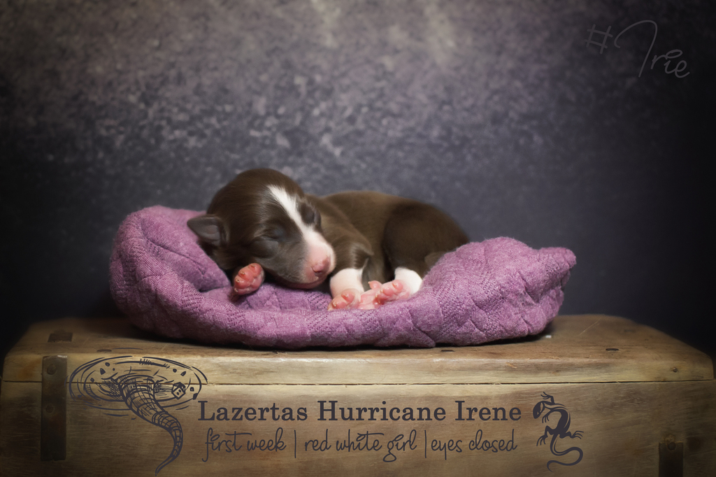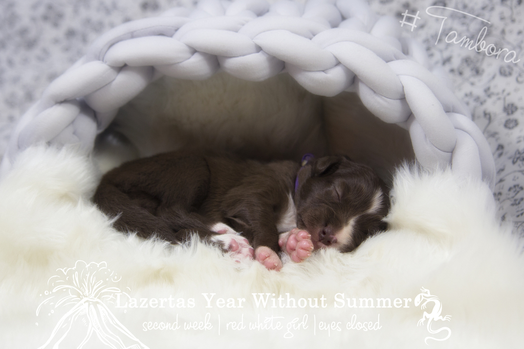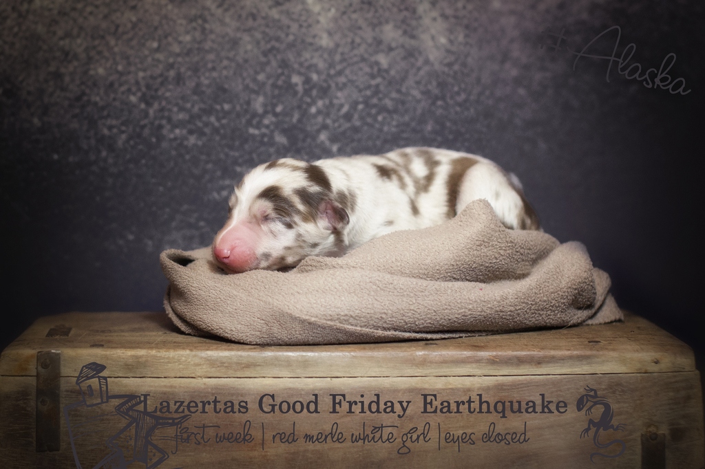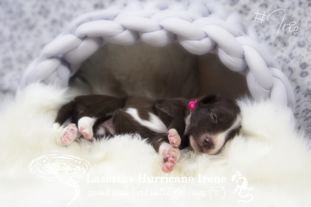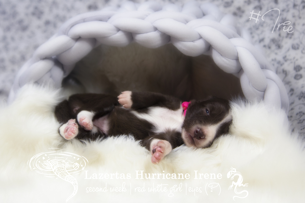 Als wir dann eh schon gebebt haben vor Begeisterung, hat Nomi noch ein superschickes und kräftiges Mädchen auf die Welt gebracht. Ja natürlich ist sie sehr sehr schön genau wie der Ort, dem sie ihren Namen verdankt. Sie hat ein braunes Vorderbein und wird kaum weiß zurückbehalten und ist bis jetzt schon sehr entspannt im daily handling. Alaska zeigt sich auch in der 2. Woche mittel im Temprament. Es war kein Problem ihre Nägelchen zu kürzen und ein paar Bilder zu gewinnen. Alaska bebte heute am 4. Tag der Zufütterung regelrecht. Sie musste UNBEDINGT essen, als Erstes und am meisten. Klar oder? Das wird sicher noch eine spannende Angelegenheit und ihr Schwänzchen ging wie verrückt. Sie ist wirklich super fröhlich, aber ohne Futti auch sehr entspannt. Ich bin sicher aus ihrer Motivation kann man sportlich sehr viel herausholen. Sie möchte sich gewiss in diese Richtung ausleben, wenn sie sich ebenso gelernt hat zurück zu nehmen. Sie ist wirklich ein wahres Erd-Bebi... So sehr sie auch baulich und charakterlich immer wieder zum Little Buddha mutiert, kommt man um ihre freudige Erregung nicht drum rum. Da wird gewedelt, wo geht und beim Fressen langt sie (weiterhin) kräftig zu. Sie hat schon ihren Namen bekommen und wird in der Lazertafamily groß und schwer. Ella hat ein wunderebare unerschrockenes Temprament. Sie kommentiert zwar immer noch gern ihre Umgebung, aber meistert alles relativ leicht. Sie nimmt auch schon mal Metall in den Mund, denn Essen kommt für sie immer in Frage :P