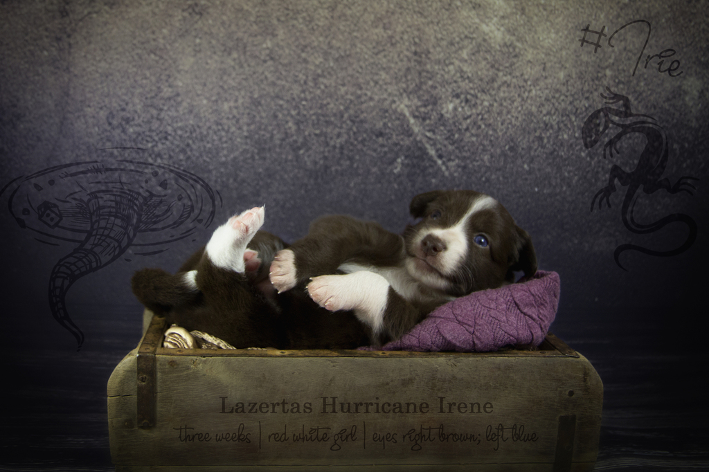 Die 2. Dracoline stürmte dann als Nächstes hervor. Noch ähnlicher war sie. Genau Papas schiefe Blesse und die unterschiedlich hohen Strümpfchen. Meine Freundin Bianca hat die Geburt begleitet und gleich Ihre Favoritin gefunden. Irie war super brav bei Ihren ersten Bildern. Allerdings will sie sicher mal die Weltherrschaft, da sie mit Vorliebe auf ihren Geschwistern liegt. Sie ist ja wirklich obersüß und weiß schon was sie will (und was nicht) in der 2. Lebenswoche. Windi (alle Welpen haben auch einen Kosenamen von Flora) ist inzwischen auch Floras Favoritin. Sie hat sich in ihr Herz geweht. Irie ist Tambora wirklich ähnlich im Charakter. Beide kann ich mir gut bei einer sozialen Aufgabe vorstellen. Irie sammelt weiter ihre Fans. Sie ist eine herrliche Frohnatur und weiterhin wie Tambora in der goldenen Mitte ihrer selbst. Fremdhundekontakte waren ihre Stärke. Ob die Chis von unseren Freunden oder der Besuchsmops - sie hat sie alle inspiziert und ist auch insgesamt sehr aufgeschlossen. Irie ist ein toughes Weib, ein strammer Ostwind, aber nicht hektisch. Ihr Job in der Therapiearbeit ist sicher und ich bin sicher, wenn man es richtig anstellt, hat sie dafür den absolut passenden Charakter. Sie hat alle(s) im Griff und auch sich selbst. Ich hätte noch 100 Fotos machen können. Sie hat so toll mitgearbeitet.