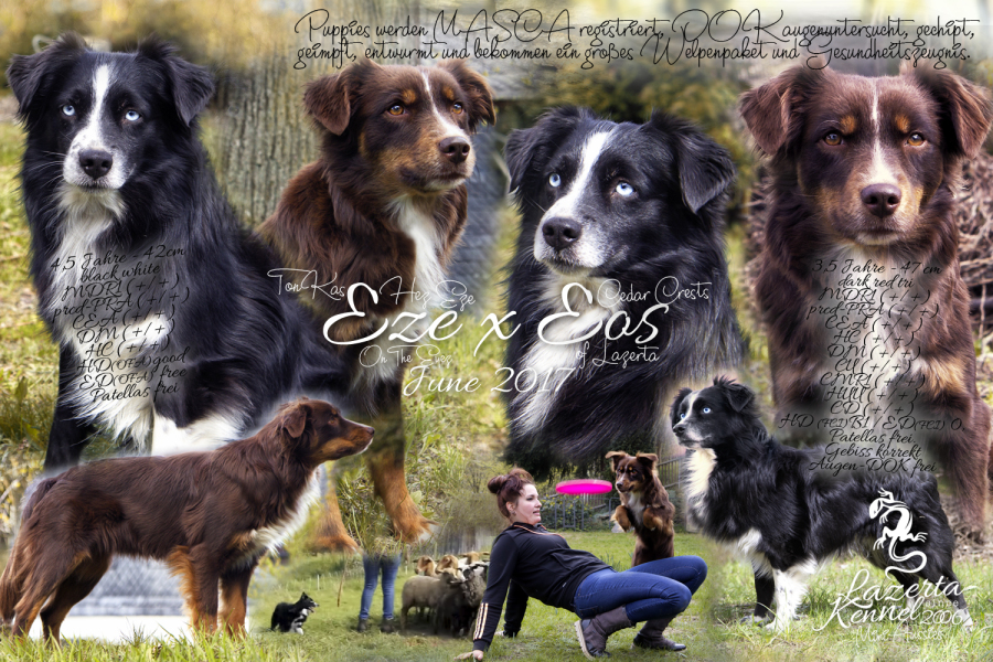 Eos und Eze stammen beide aus den USA und wurden von uns improtiert. Auf die Beiden warteten wir jeweils fast 2 Jahre. Beide Hunde entstammen zum Teil sehr ursprünglichen, alten Standard(arbeits)linien und arbeitenden Mini-Aussielinien. Nicht zuletzt deswegen richtet sich dieser Wurf an sportliche Menschen mit viel Herz und ruhiger, klarer Führung in der Ausbildung des Aussies. Eos und Eze sind wahr gewordene Träume, Engel auf Erden und wir erwarten ihre Bodenschätze (Motto) Anfang Juni in Black - und (Darkdarkdark) Red - bi oder mit wunderschönen, kräftigen Kupferabzeichen. Die Wartezeit kann so lang sein *seufz* - wir erwarten die Welpen ab dem 1. Juniwochenende.