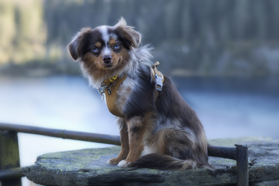 Reza stammt aus der Verpaarung von Cookie (kleine Amerikanerin, Toy 33 cm) und Venom (kleiner Amerikaner 35 cm), er wurde nicht von mir gezüchtet und wird am 10. Juni ein Jahr alt. Reza ist 33 cm groß und wiegt 4,5 kg. Er ist ein wirklich kleiner Aussie und hat ein großes Herz für alle Menschen. Ein bisschen sensibel ist er schon. Er steckt natürlich gerade in der Pubertät, die sich bei ihm eher als Spookyphase äußert. Mit schnellen Bewegungen kommt er nicht sehr gut zurecht, aber man kann ihn sehr gut mitnehmen und er taut wirklich schnell auf. Das Charakterbild entspricht einem aktiven Kleinhund. Ab und zu zittert er auch vor Aufregung - seine Freude kennt oft keine Grenzen, dann springt er wie ein kleiner Flummiball umher. Er hat wirklich viel Power und möchte auch unheimlich gern trainiert werden. Er braucht durch seine Sensibilität, eine Familie die ihn sicher führt, denn wenn er alleine entscheiden muss, verliert er sich etwas. Er liebt es zu kuscheln und schläft gerne im Bett. Unterwegs war er schon öfter - zuletzt ist er sogar mit in die Berufsschule von unserer Mitbewohnerin gegangen. Dort liebte er auch jeden und kam schnell sehr gut zurecht. Reza braucht noch etwas Feinschliff, aber das ist in seinem zarten Alter absolut vertretbar. Er hat eine richtig tolle Fellfarbe. Sein Red Merle schillert in ganz verschiedenen Farbnuancen und sein Kupfer ist feuerrot.